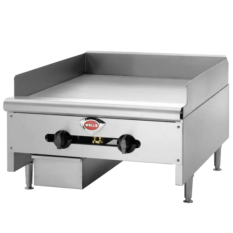 Wells HDG-2430G Countertop Gas Griddle is extra heavy-duty and features a 3/4" griddle plate for quick pre-heat, even heat distribution, and fast recovery. Each control features an adjustable air shutter to control air and optimize combustion. Removable stainless-steel front panel, stainless-steel side panels and splash guard, full-width, front mounted grease trough, removable large capacity drip pan for ease of clean-up and adjustable 4" heavy-duty steel legs. Ships in natural gas and are field convertible to LP Gas. Manual Controls, 24"W x 23.75"D cooking surface, and 60K BTU