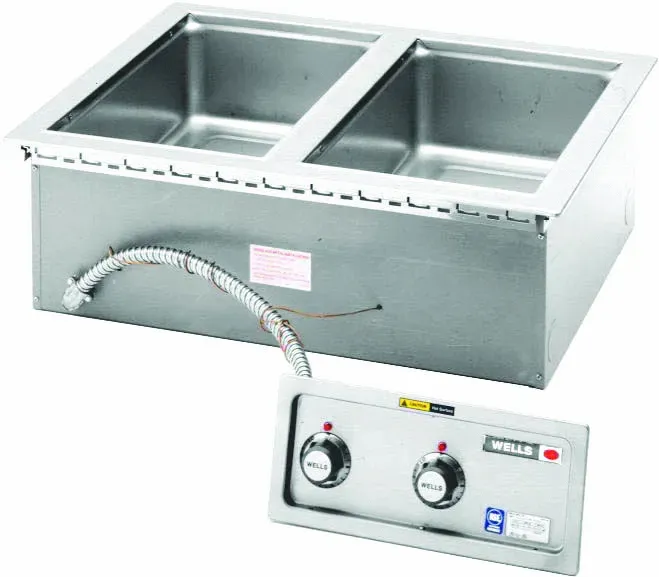 Wells MOD-200TDM heavy-duty, top-mount, drop-in, Modular food warmer is designed to hold heated foods at safe and fresh serving temperatures. Unit Accommodates 12" x 20" standard food pans or equivalent fractional inset pans and are designed for wet or dry operation. One-piece stainless steel top flange and heavy-gauge, deep-drawn stainless steel warming pans are standard features on all models. WellsLoks are standard for quick and easy installation. Sides, front, back, and bottom are fully insulated, Individual controls for each well, High-limits prevent overheating, and powerful tubular heating elements are located under the warming pans for quick, efficient, and even heating. Two pans, Thermostatic control, Drain with Manifold, 208/240V